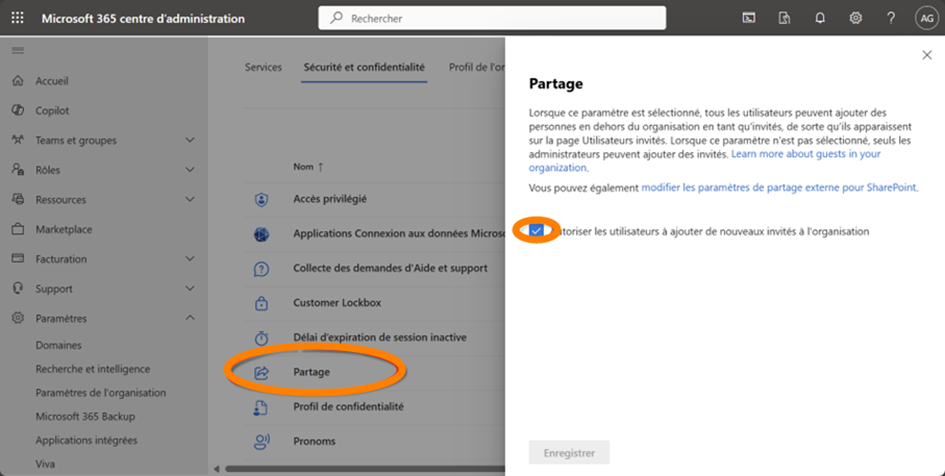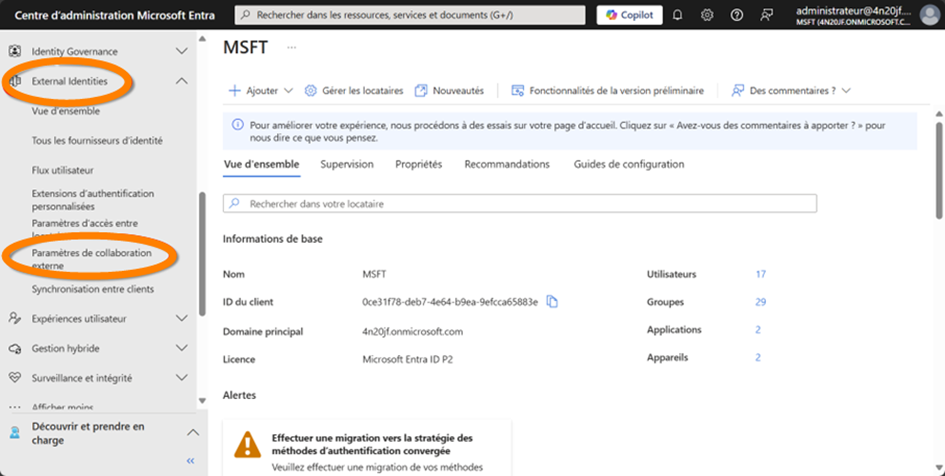 Pour configurer les options de partage qu’auront les utilisateurs, cela se passe dans le Centre d’administration Entra :