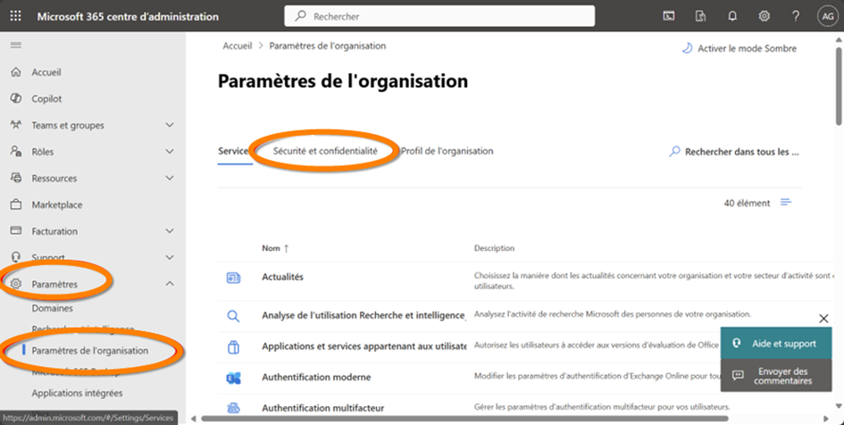 Sélectionnez Paramètres, Paramètres de l’organisation puis Sécurité et confidentialité.