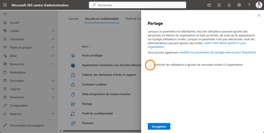 En cliquant sur Partage, vous pourrez désactiver l’accès invité en décochant Autoriser les utilisateurs à ajouter de nouveaux invités à l’organisation.