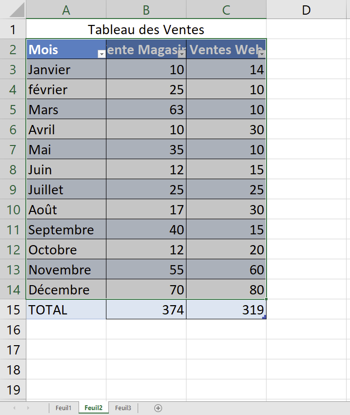 ● Sélectionner les données du tableau en faisant attention à ne pas sélectionner la ligne Total