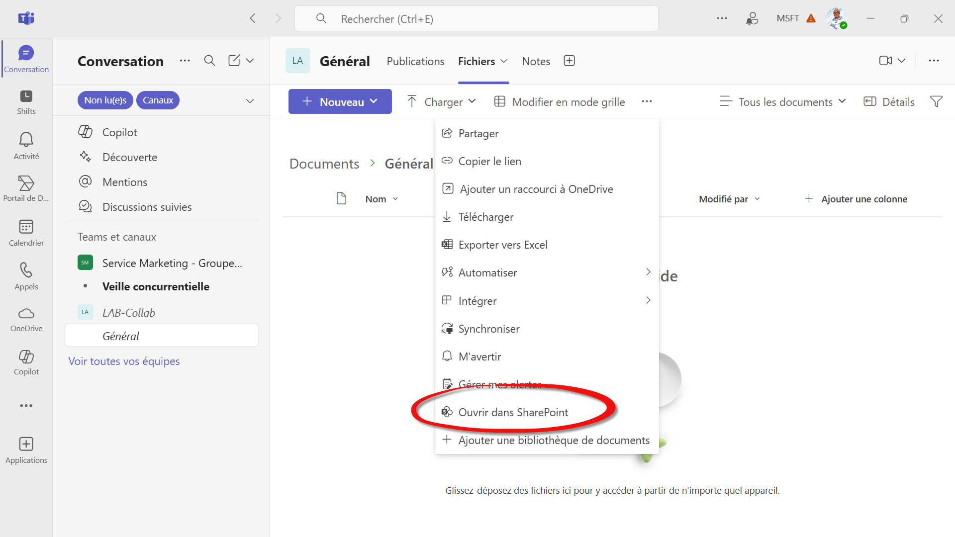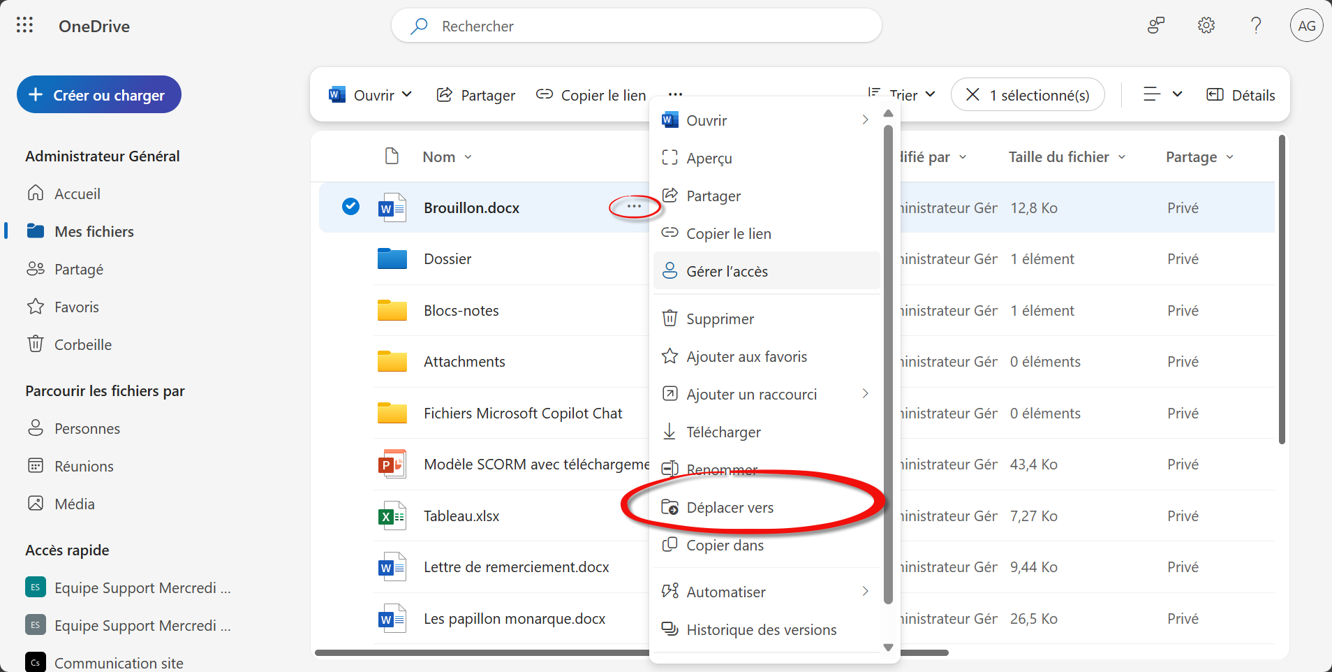 Déplacez ensuite le fichier vers la bibliothèque du canal “partenaires” pour basculer sous gouvernance d’équipe.