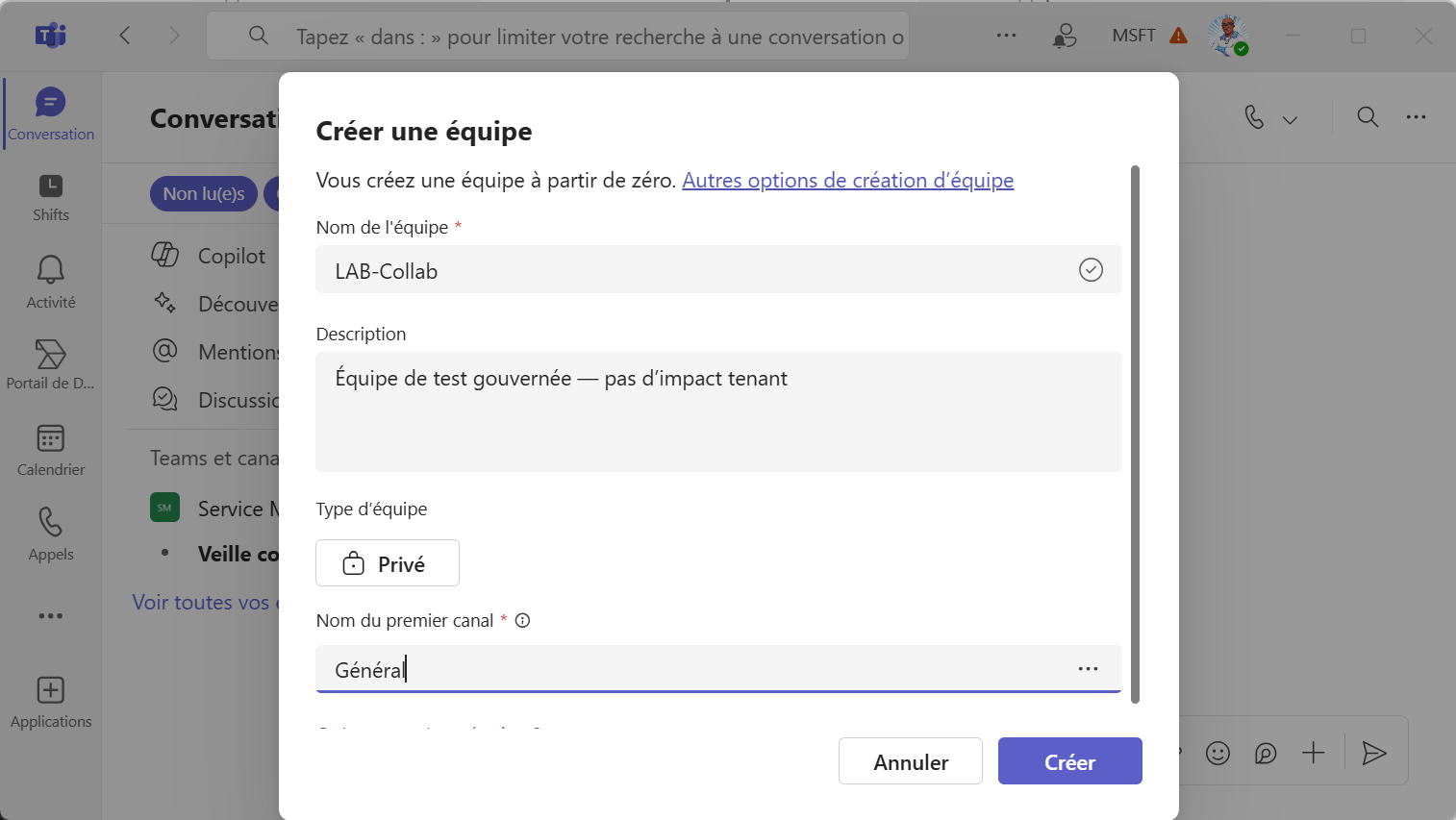 Choisissez « À partir de zéro » > « Privée », nommez-la (ex.: LAB-Collab), ajoutez une description “Équipe de test gouvernée — pas d’impact tenant”.