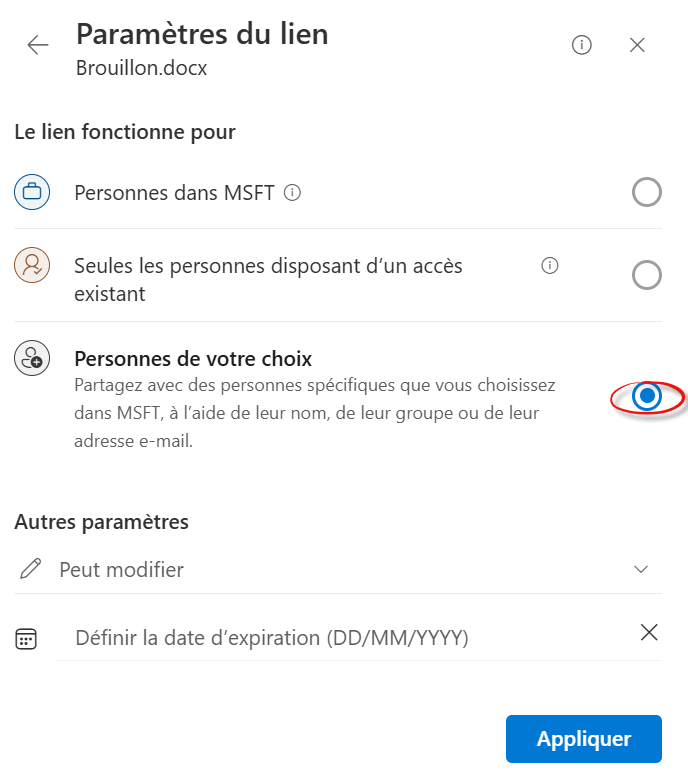 Dans OneDrive, créez “Brouillon.docx” et partagez en “Personnes spécifiques”.