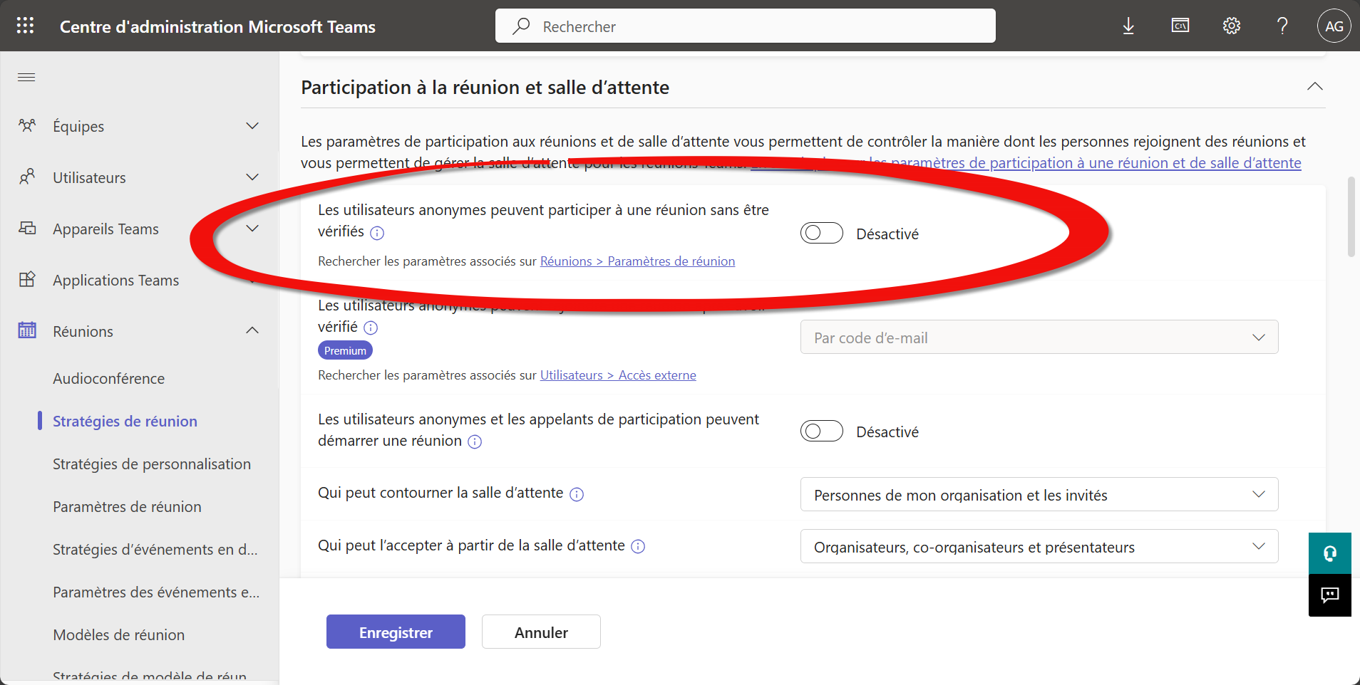 Décochez Les utilisateurs anonymes peuvent participer à une réunion sans être vérifiés