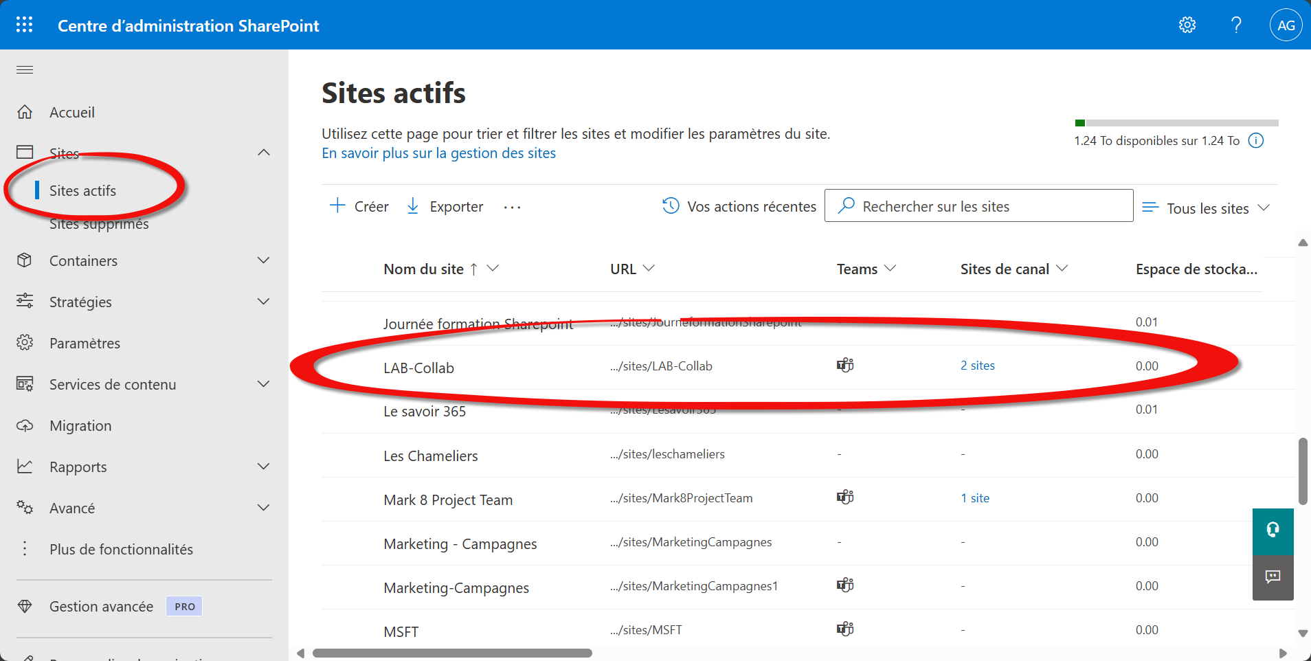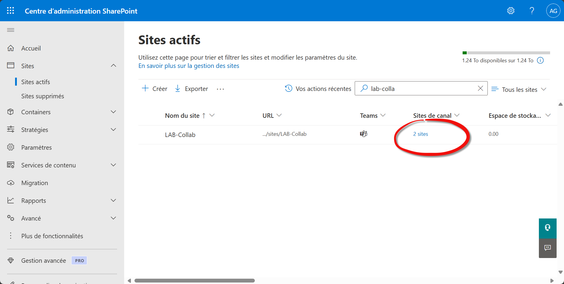 Pour le canal privé “budget-interne” et le canal partagé “partenaires”, repérez leurs sites associés (créés automatiquement) et appliquez le même niveau de partage.