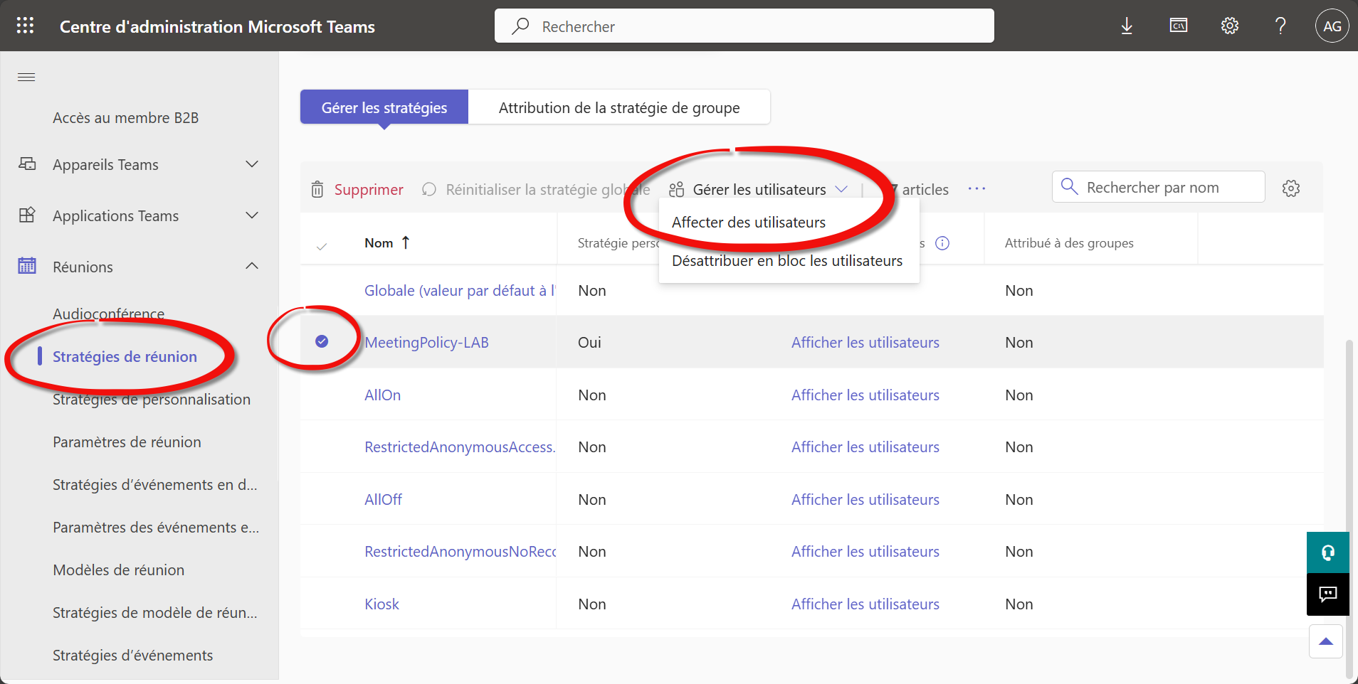 Attribuez “MeetingPolicy-LAB” uniquement à un compte utilisateu