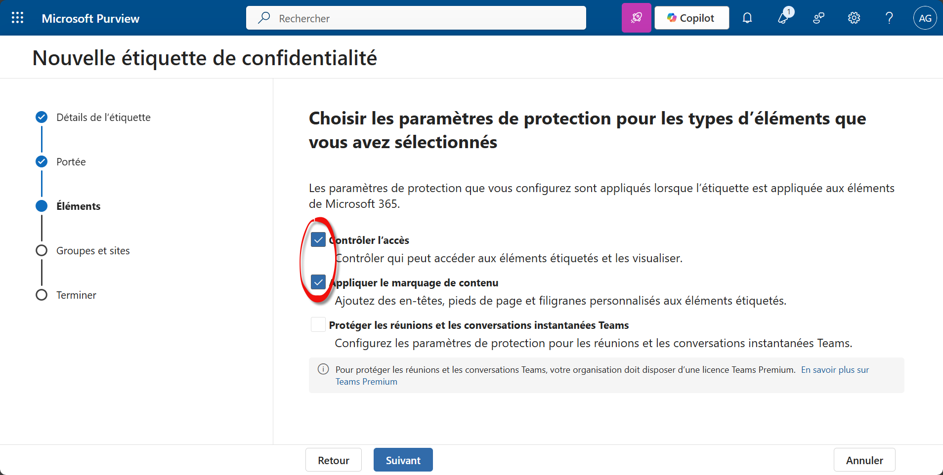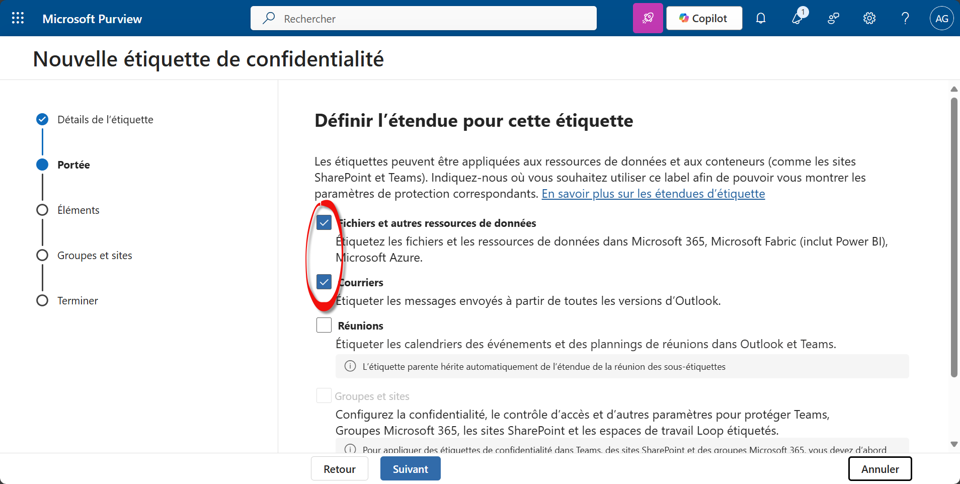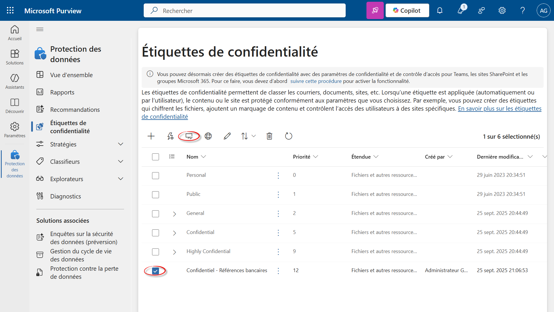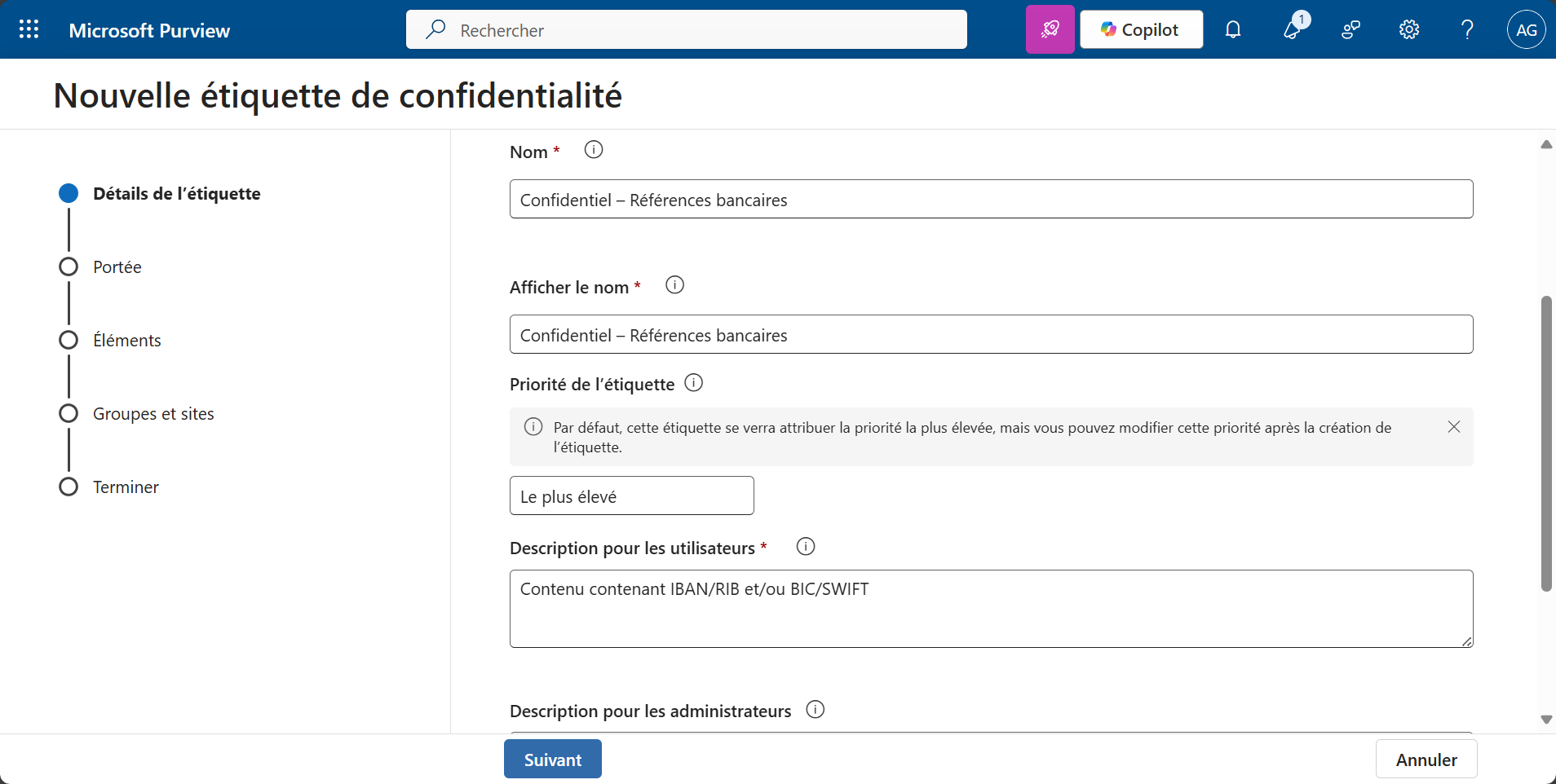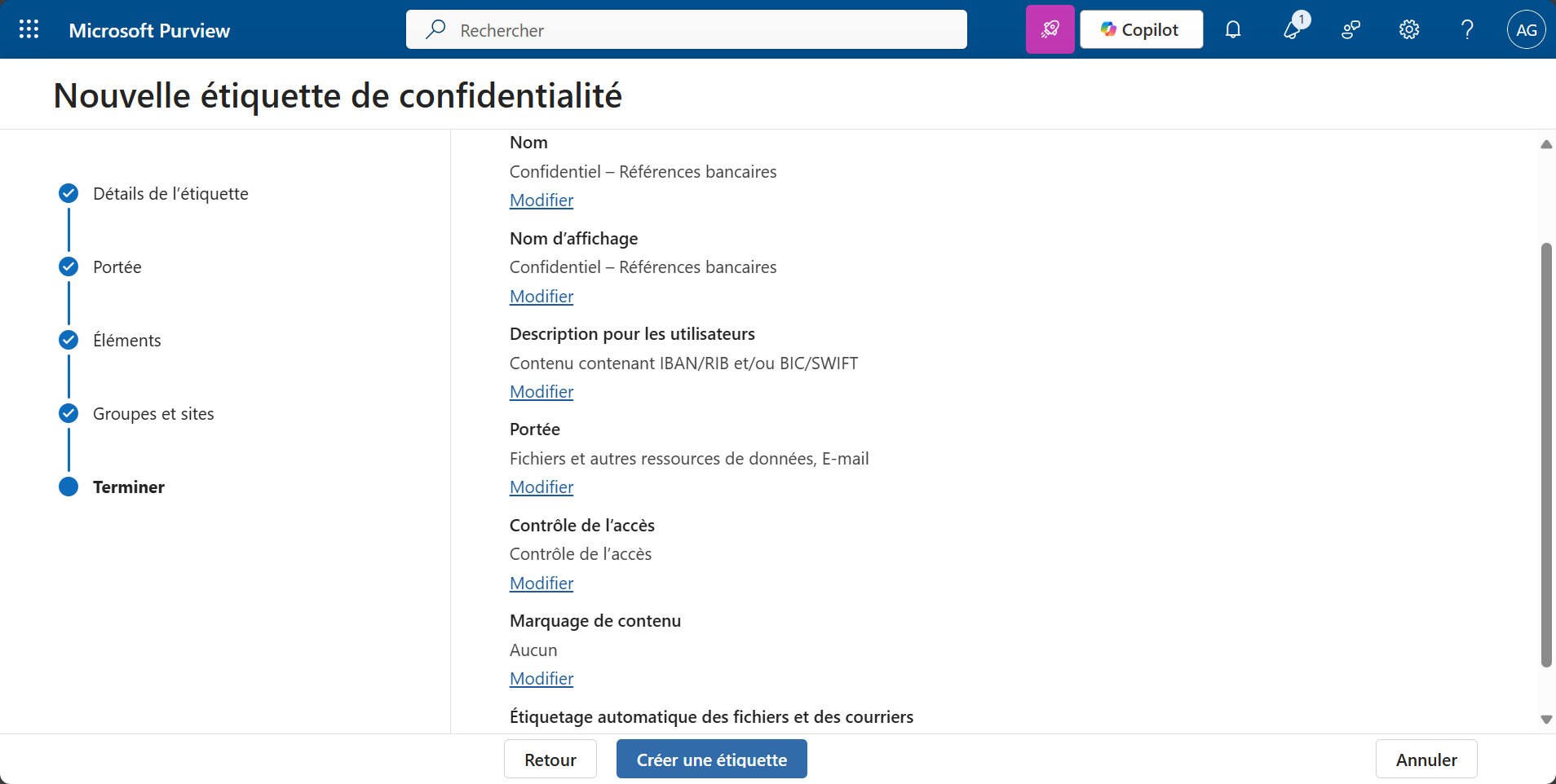 Portail Microsoft Purview > Solutions > Protectionn des données > Étiquettes de confidentialité > Créer une étiquette.