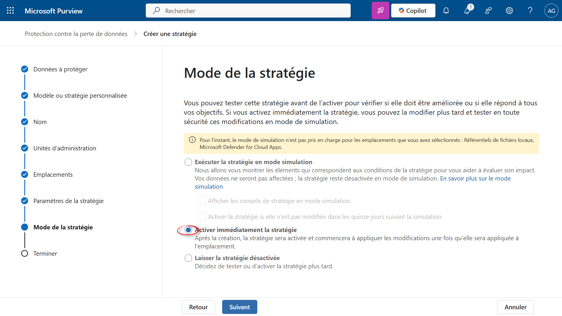 Cliquez sur Suivant jusqu'à l'étape Mode de la stratégie séléctionnez Activer immédiatement la stratégie.