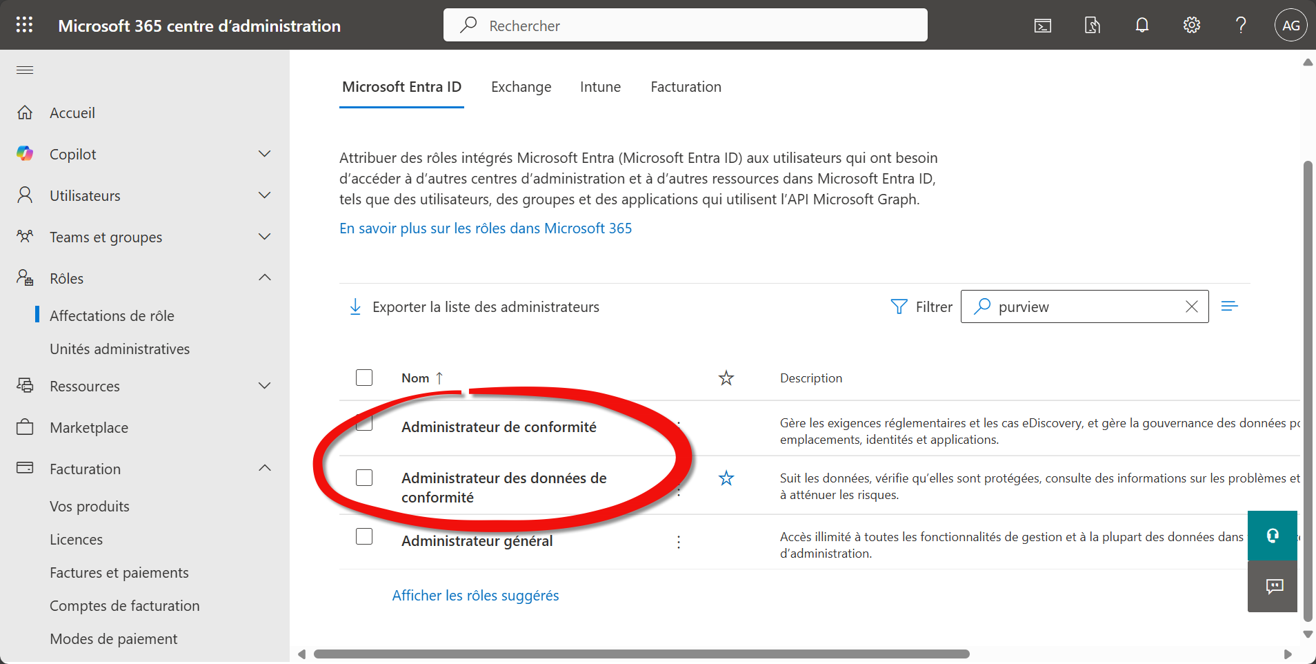 Rôles d’admin Purview: Administrateur de conformité et Administrateur des données de conformité
