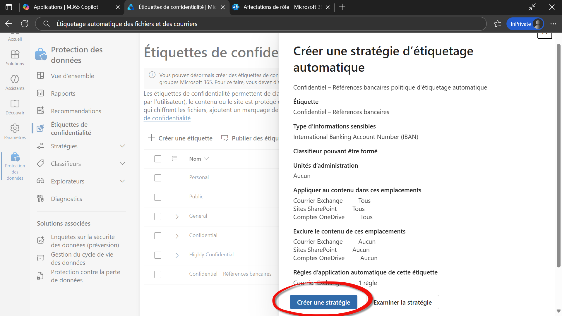 Dans le cadre d’un déploiement Microsoft 365, une organisation française gère quotidiennement des coordonnées bancaires (IBAN/RIB et codes BIC/SWIFT) échangées par courriel et intégrées à des documents contractuels; pour réduire les risques d’erreur d’envoi et d’exfiltration tout en respectant le RGPD, elle souhaite que toute apparition de ces références dans Word ou Outlook déclenche automatiquement l’application d’une étiquette de confidentialité avec marquage visuel et, le cas échéant, des restrictions de partage externe et une journalisation des actions. Le scénario implique des utilisateurs métiers qui rédigent ou reçoivent des messages et documents contenant des IBAN, ainsi que des interlocuteurs externes. L’objectif du TP est de configurer dans Microsoft Purview une étiquette “Confidentiel – Références bancaires”, d’activer l’auto‑étiquetage basé sur la détection d’IBAN/BIC et de mettre en place des conseils de stratégie dans Outlook demandant une justification en cas d’override, tout en s’assurant que les documents stockés sur OneDrive/SharePoint conservent leur marquage et que les événements apparaissent dans les rapports DLP pour audit et suivi.