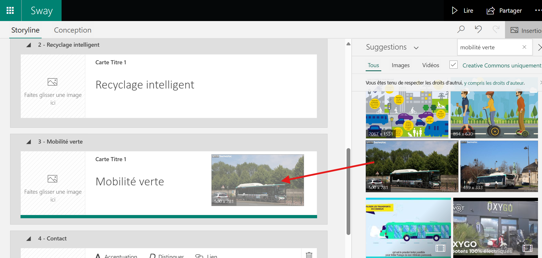 Sway facilite Ă©galement lâintĂ©gration de contenus dynamiques venus de lâextĂ©rieur. On peut faire glisser dans sa composition des images, vidĂ©os ou tweets simplement en les sĂ©lectionnant dans le volet de recherche. Cette approche âglisser-dĂ©poserâ permet dâenrichir le panneau sans perdre de temps ni complexifier le processus de crĂ©ation. Les contenus ainsi intĂ©grĂ©s sont automatiquement adaptĂ©s Ă lâenvironnement visuel de Sway, pour une cohĂ©rence dâensemble.