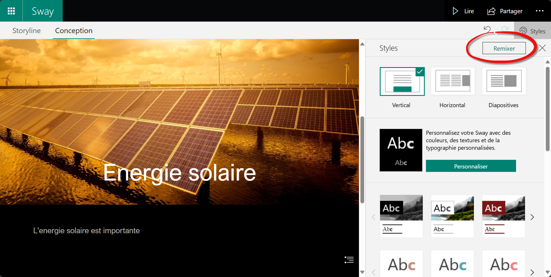 Pour les utilisateurs qui ne veulent pas passer trop de temps sur la mise en page, Sway propose un bouton magique : le âRemixâ. En un clic, la prĂ©sentation est automatiquement repensĂ©e Ă partir de modĂšles prĂ©dĂ©finis : couleurs, typographies, disposition des Ă©lĂ©ments⊠tout est rĂ©organisĂ© pour rendre le panneau plus harmonieux et professionnel. Cela permet Ă chacun de crĂ©er un rendu esthĂ©tique, mĂȘme sans compĂ©tences en design graphique.