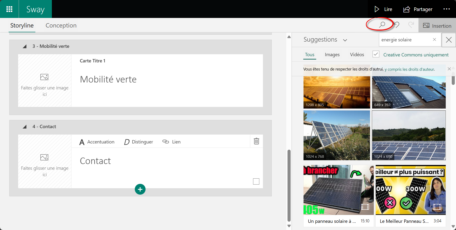 Lâun des grands atouts de Sway est son outil de recherche intĂ©grĂ©. Il permet de trouver et dâimporter du contenu depuis Bing, YouTube, Twitter, OneDrive, ou encore Wikipedia. Par exemple, si on construit un panneau sur un sujet dâactualitĂ© ou un thĂšme pĂ©dagogique, on peut directement insĂ©rer une vidĂ©o explicative trouvĂ©e sur YouTube ou une image libre de droits via Bing Images. Cette recherche se fait depuis lâinterface mĂȘme de Sway, ce qui Ă©vite de passer par une multitude dâonglets ou de copier-coller des Ă©lĂ©ments maladroitement.